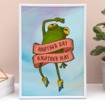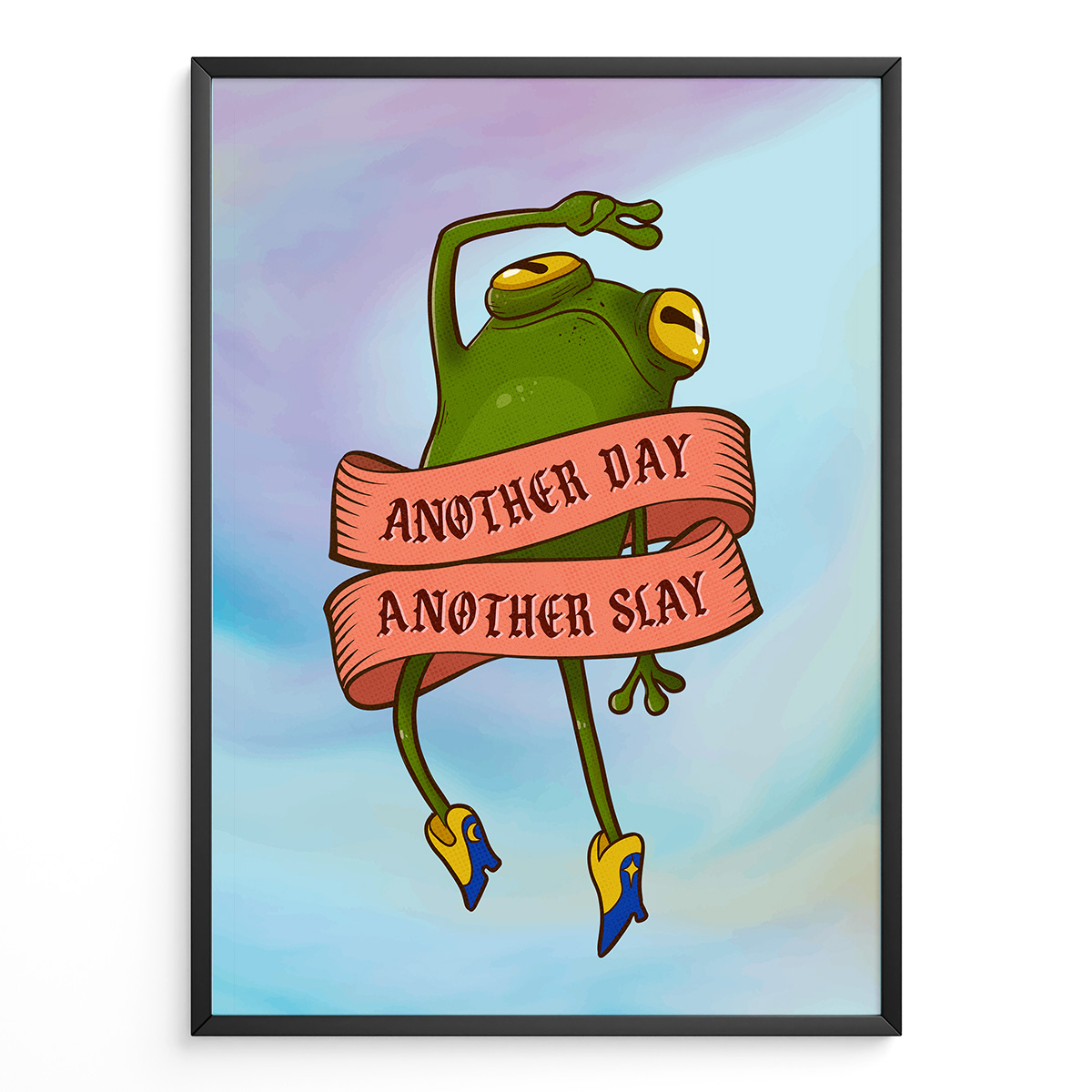 Starta dagen med en dopaminkick med denna sköna grodposter. Motivet visar en fabulous groda i cowboy-boots och en banner med texten “Another Day, Another Slay”.