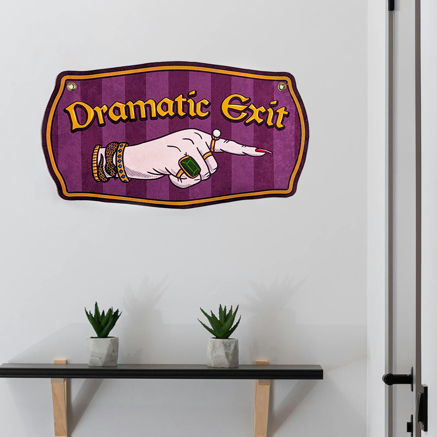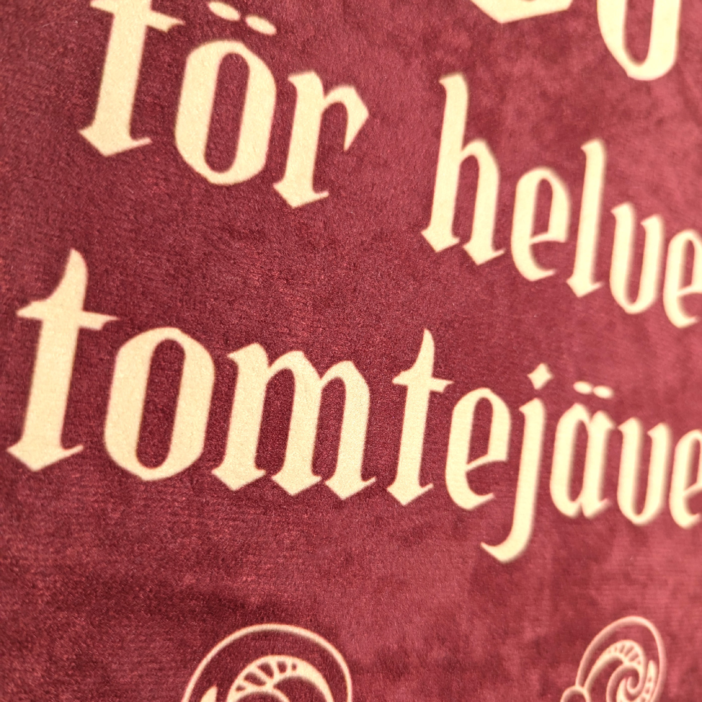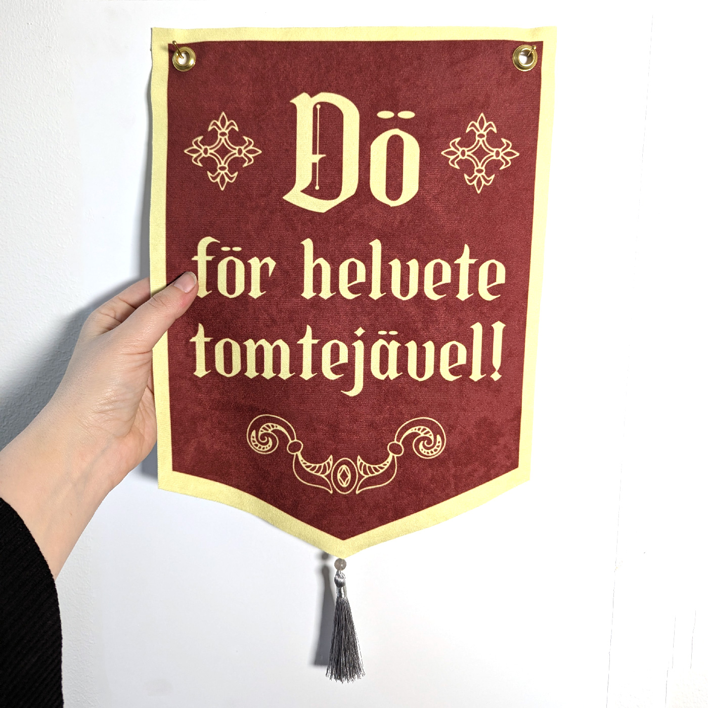 Handgjord julig väggbonad med texten “Dö för helvete tomtejävel!” i röd och ljusgul. Citat från den underbara julfilmen Tomten är far till alla barnen från 1999.