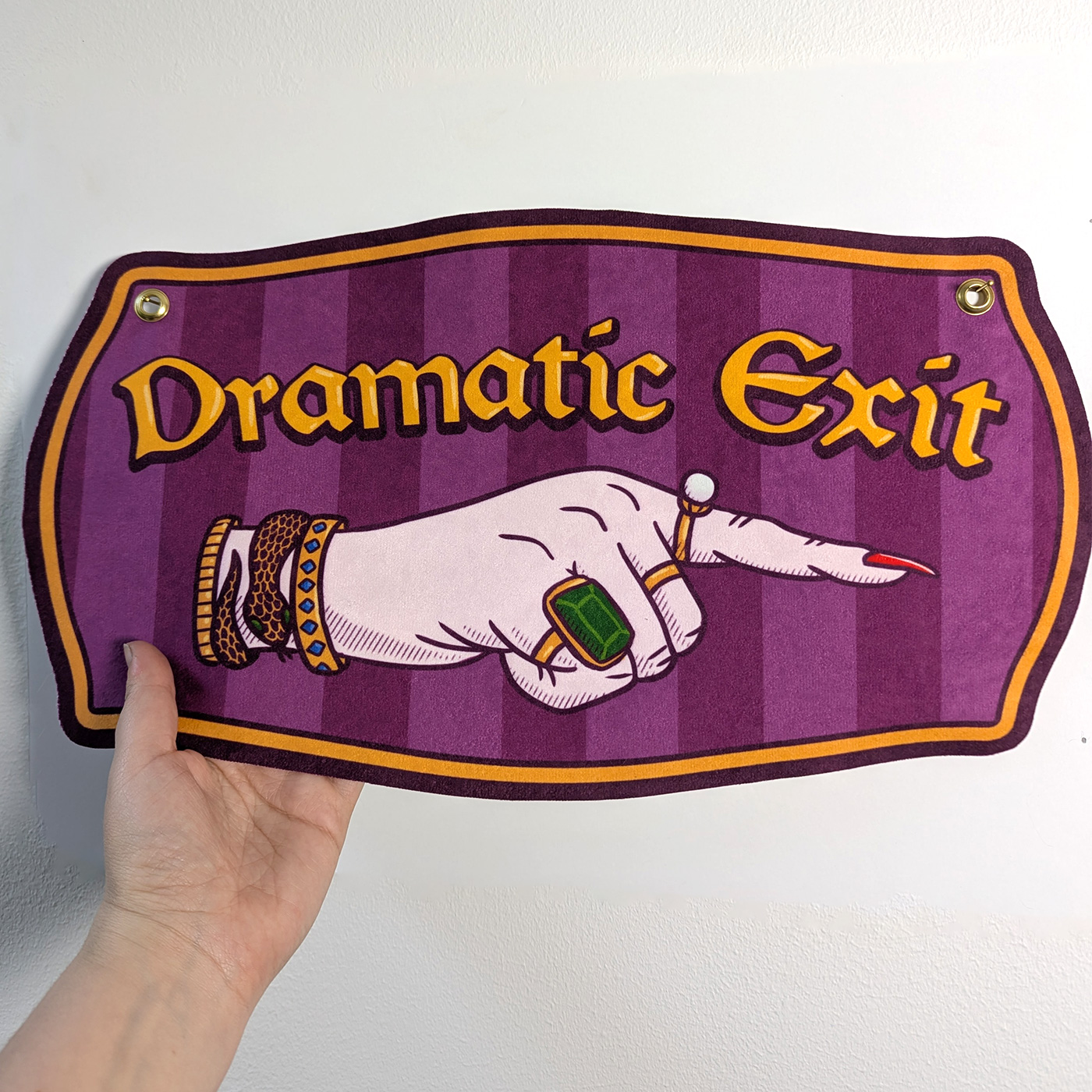 Handgjord väggdekoration i underbara rosa och gula färger. Föreställer en pekande smyckesklädd hand och texten Dramatic Exit.
