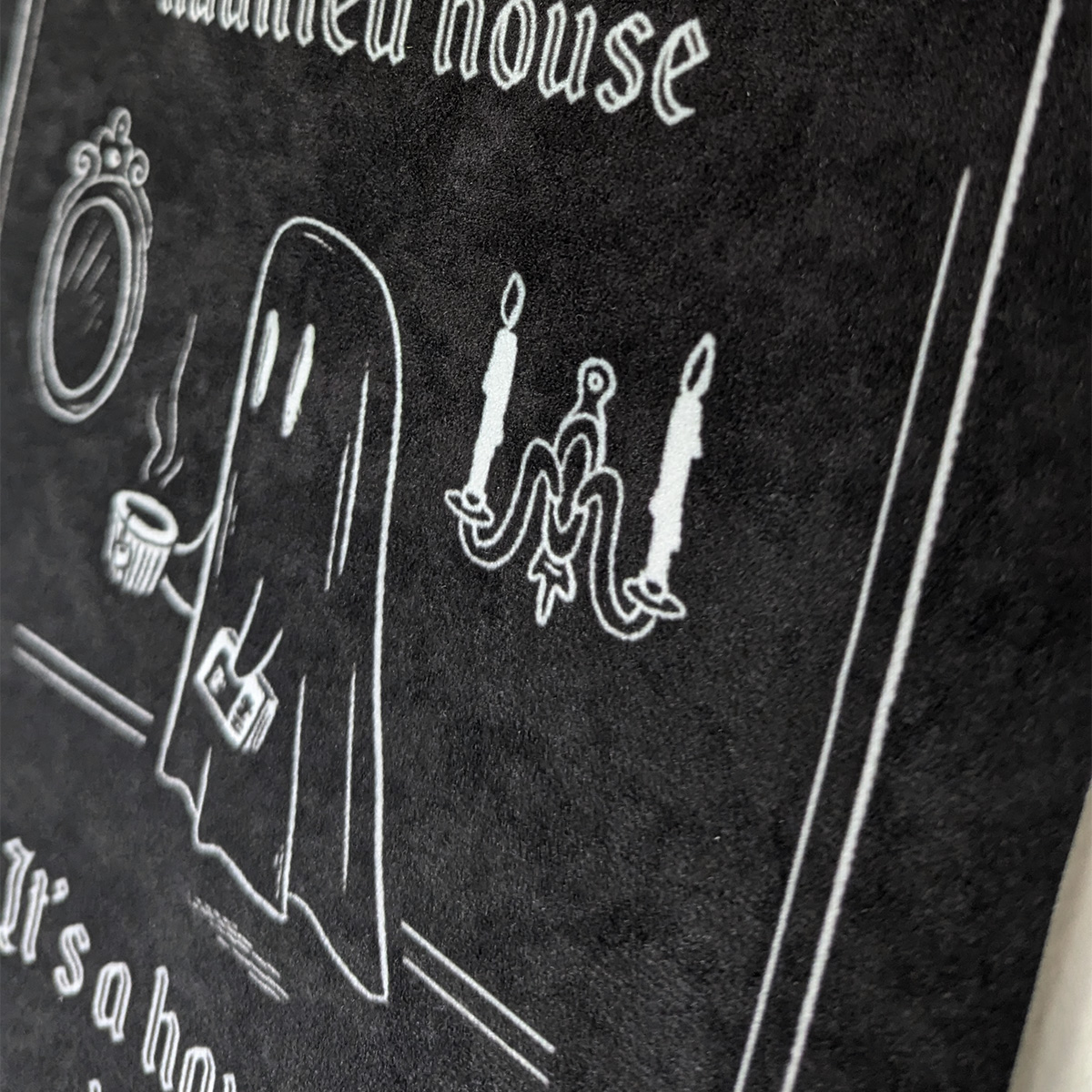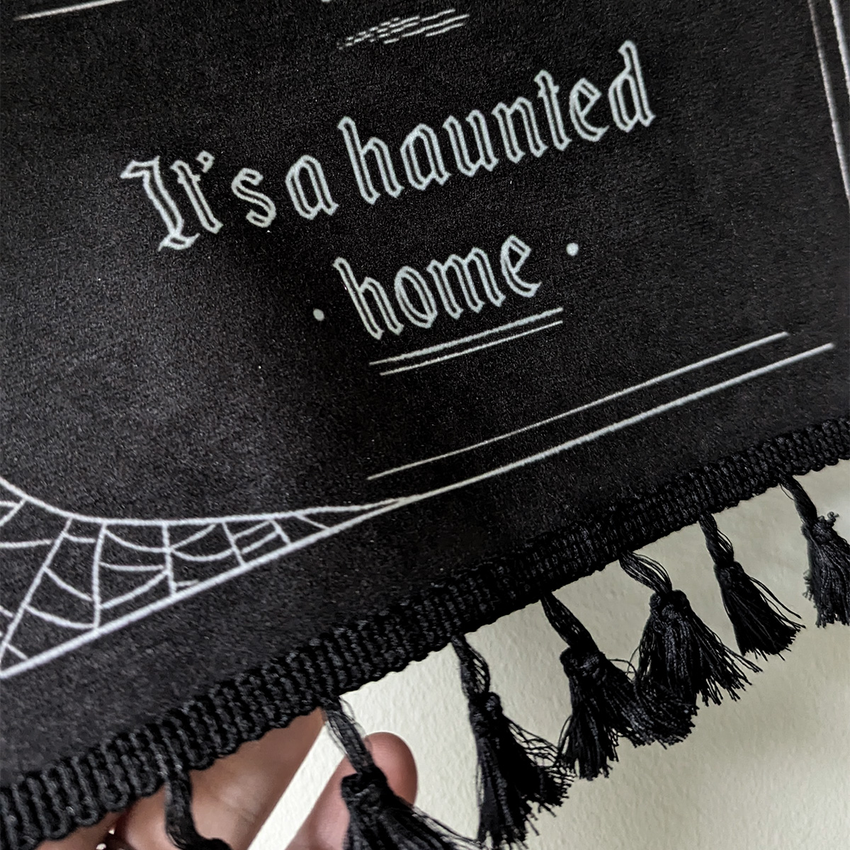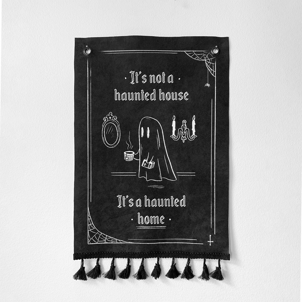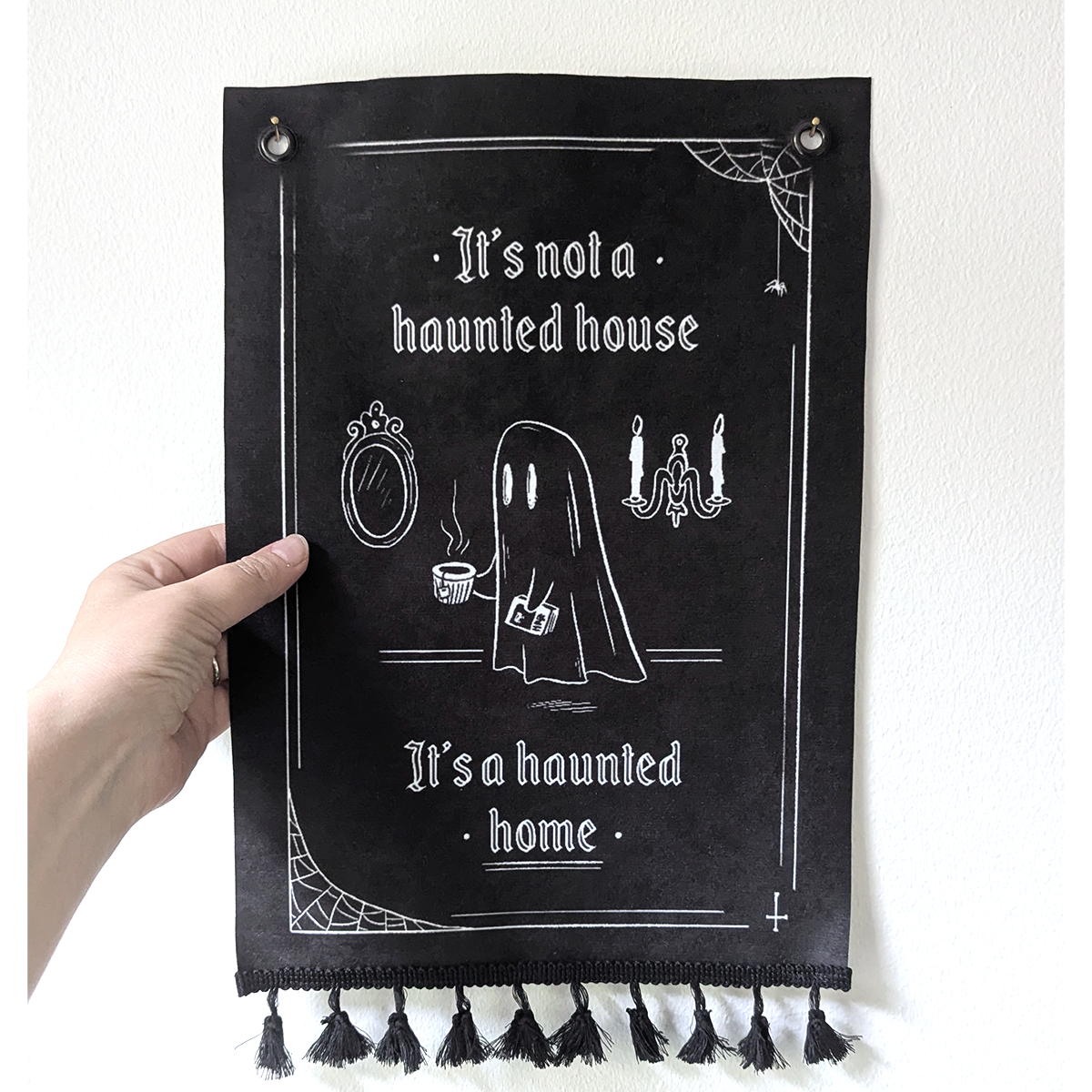 Handgjord väggdekoration med texten “It’s not a haunted house, it’s a haunted home”. Gulligt spöke som dricker te och spindelnät = mysig och spooky! Passar Halloween men även resten av året.