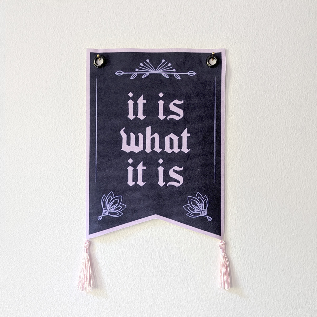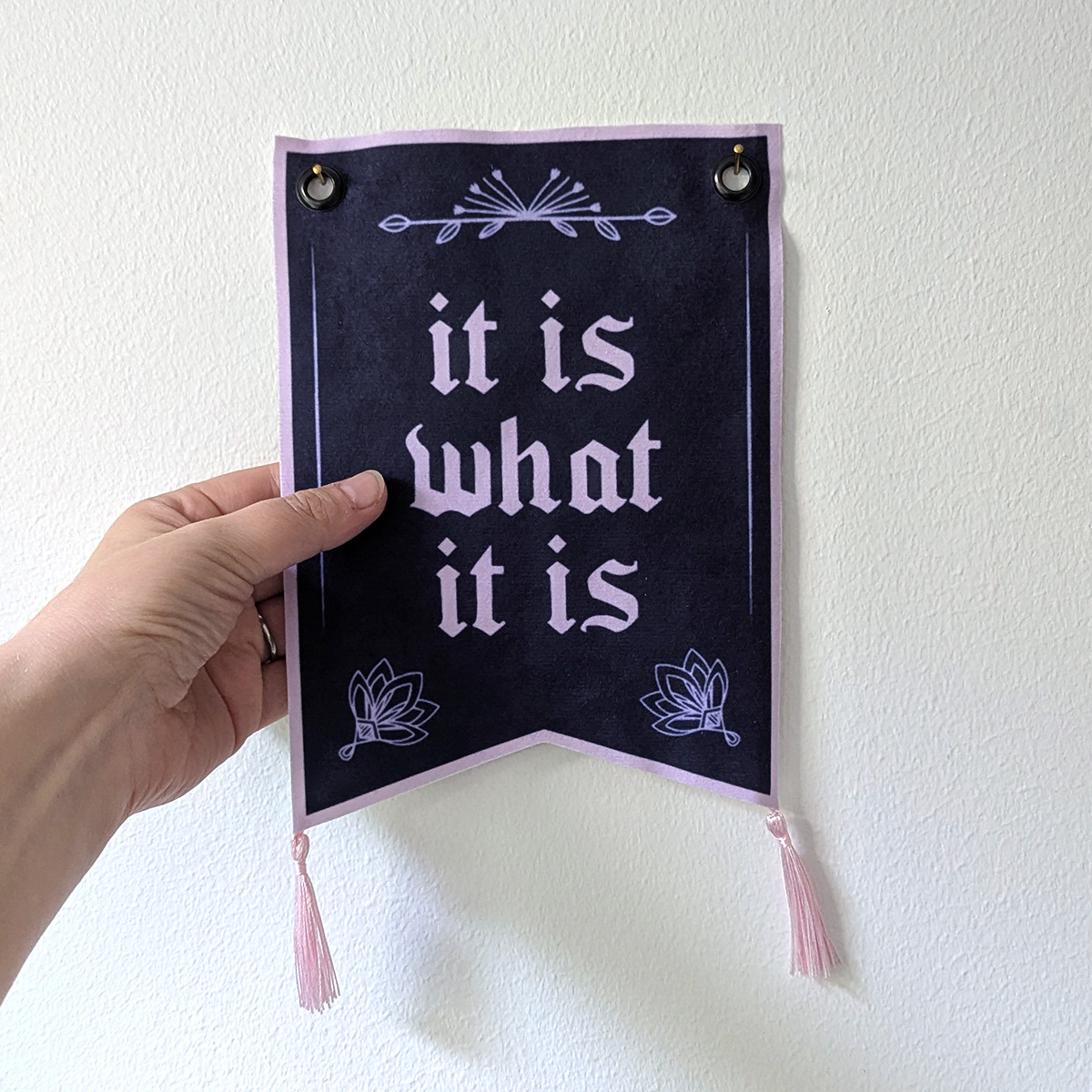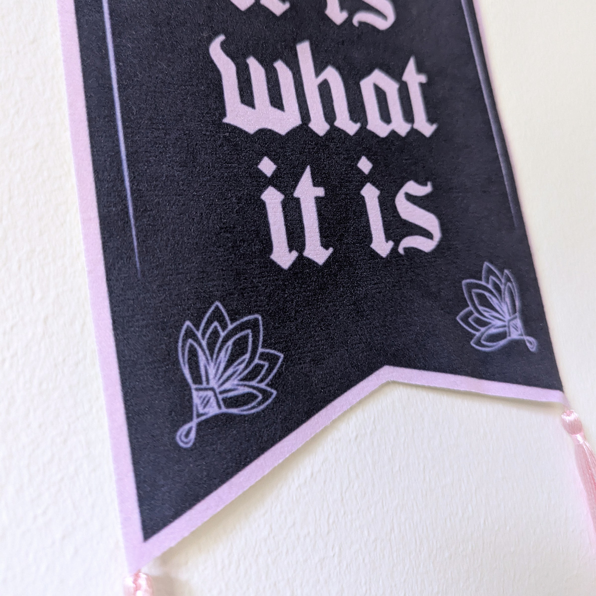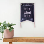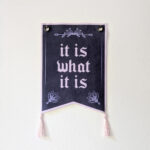 Fin handgjord, lite mindre väggbonad med texten “It Is What It Is” i lila och rosa.