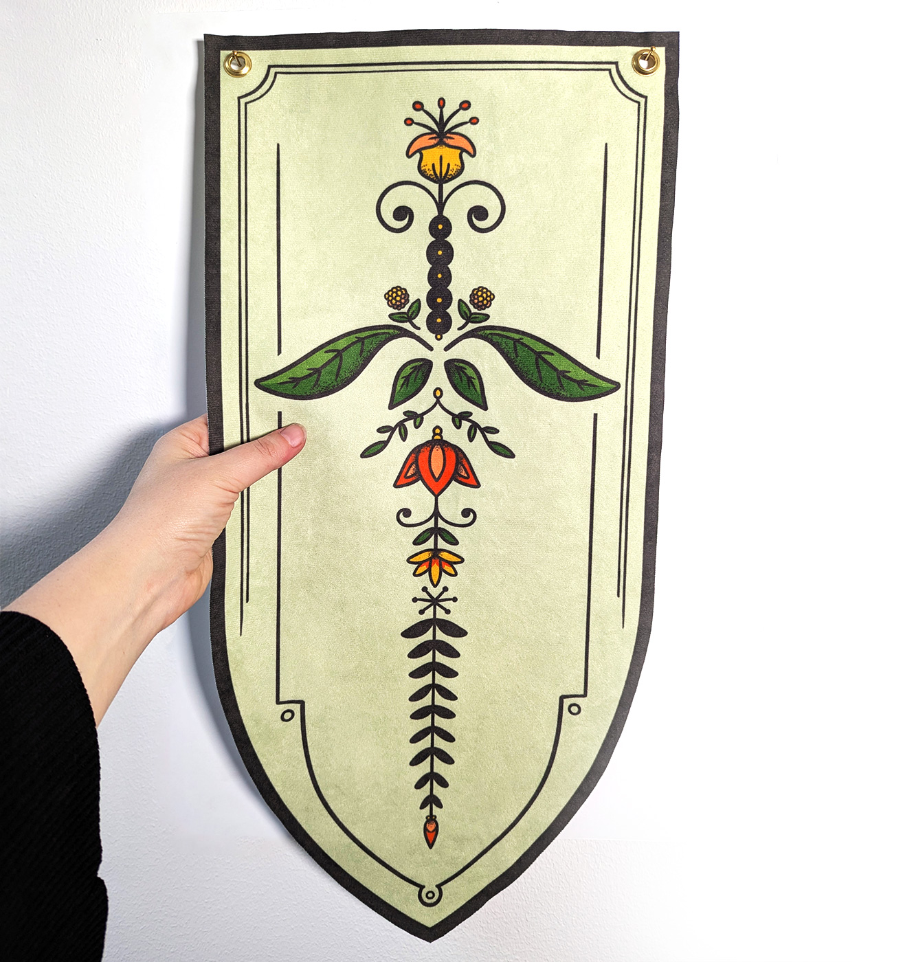 Handgjord väggbonad inspirerad av svensk kurbitskonst, i formen av ett svärd på en sköld.
