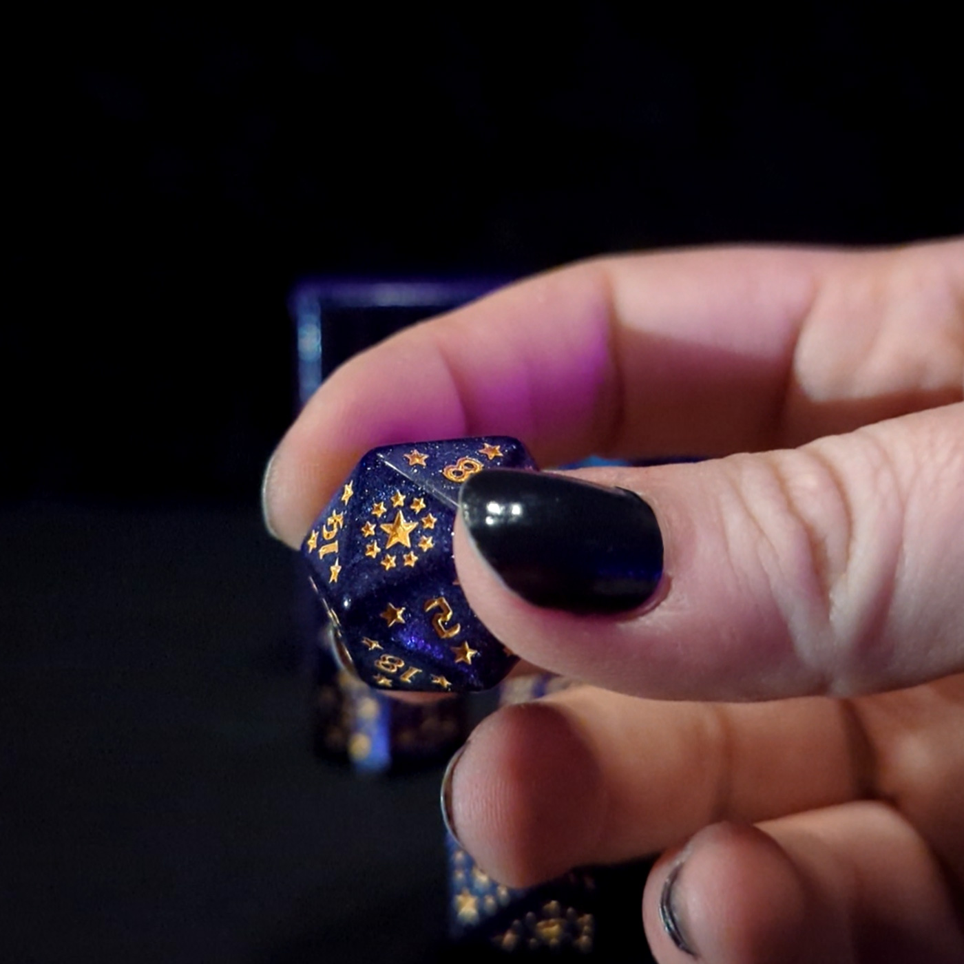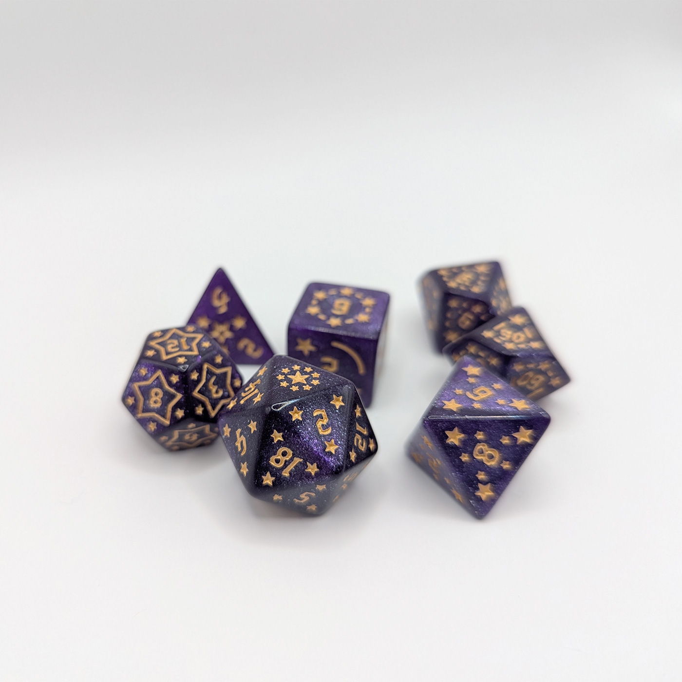 Setet innehåller 7 akryltärningar med gyllene siffror och stjärnornament, infärgade i djup lila med skimrande glitter som fångar ljuset som en kristallkula.