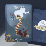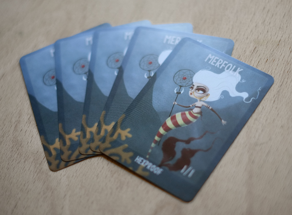 Ett set med 5 blå Merfolk-tokens för Magic: the Gathering.