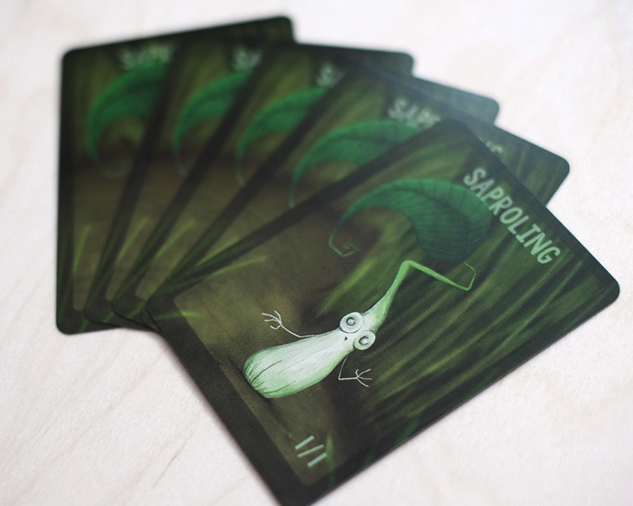 Ett set med 5 gröna Saproling-tokens för Magic: the Gathering.