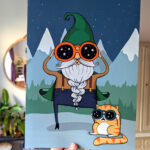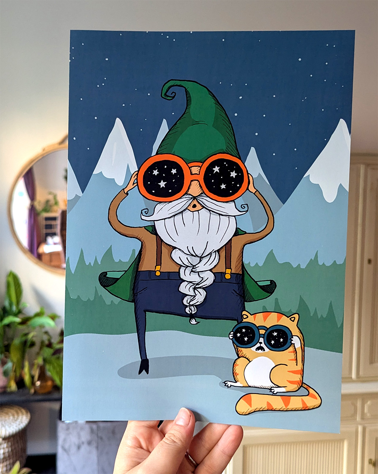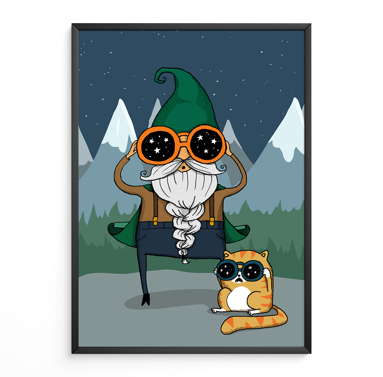 Utforska universums mysterier med denna poster av en trollkarl och hans orangea katt!